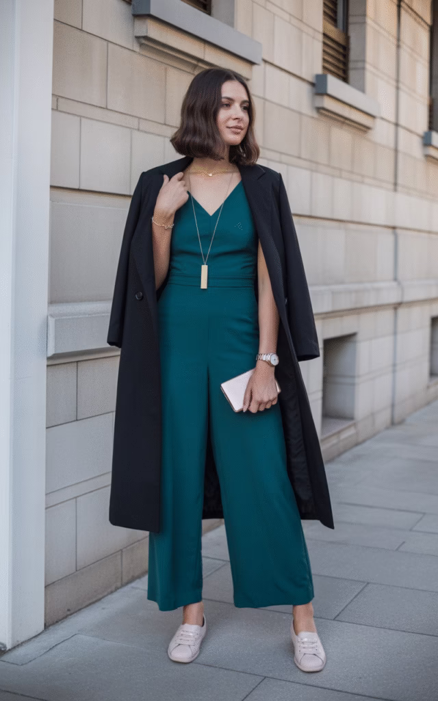 - Dress: Tailored, full length jumpsuit in a deep color like navy or emerald