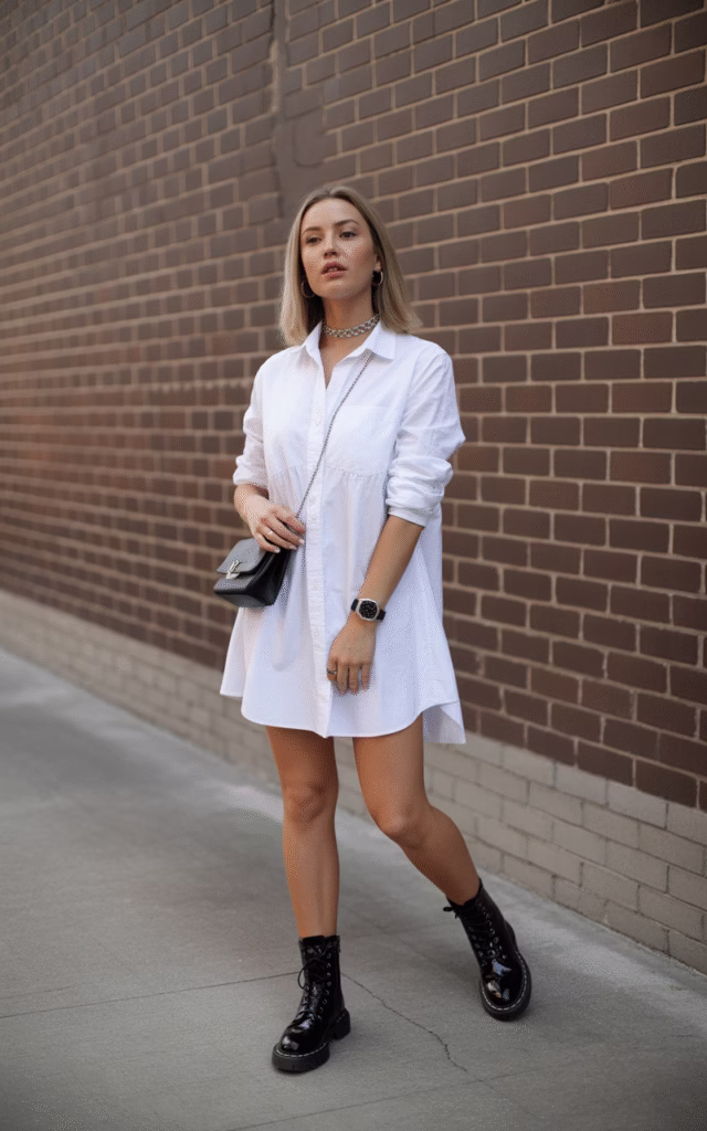 A crisp white shirt dress paired with combat boots gives a powerful yet easy look.