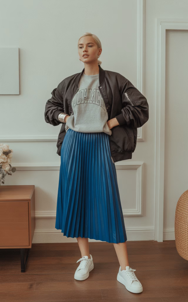 - Bottom: Pleated Midi Skirt in Cobalt Blue Faux Leather