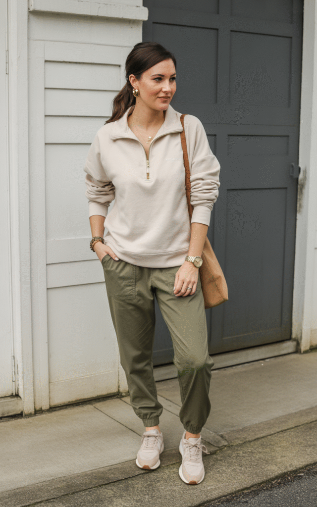 - Bottom: Olive green cargo joggers