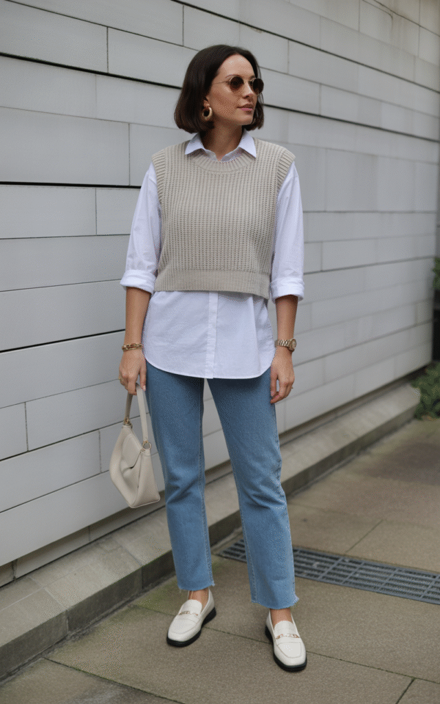 - Top: Cream sweater vest over white shirt