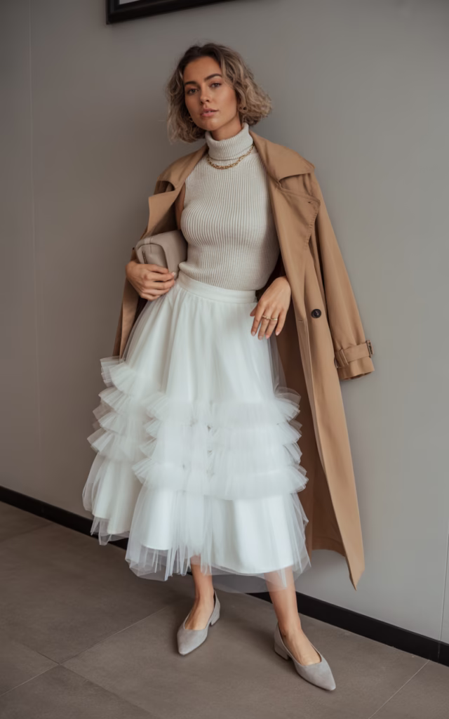 The subtle texture of the skirt adds visual interest, preventing the all white look from becoming flat.