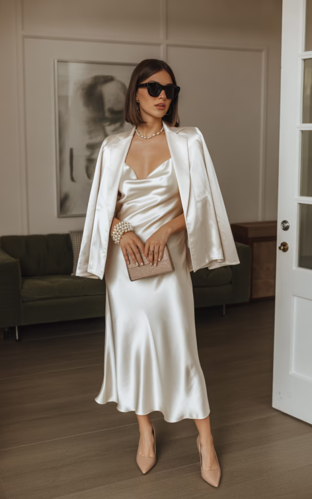 The fluid satin fabric drapes beautifully, making the whole look feel effortlessly luxurious.