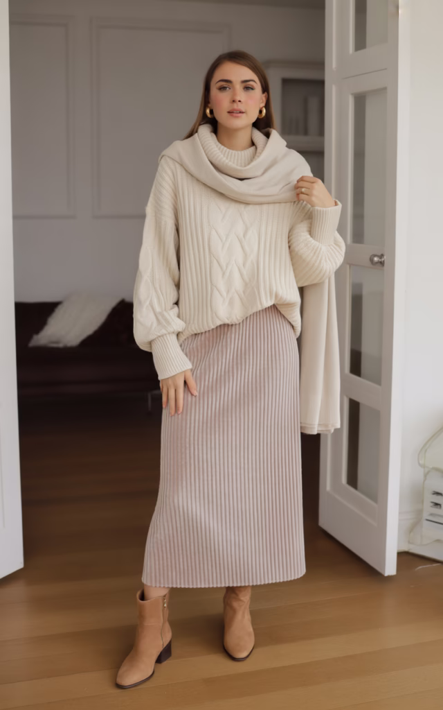 The chunky knit adds a beautiful, soft texture that makes the whole look feel inviting and warm.