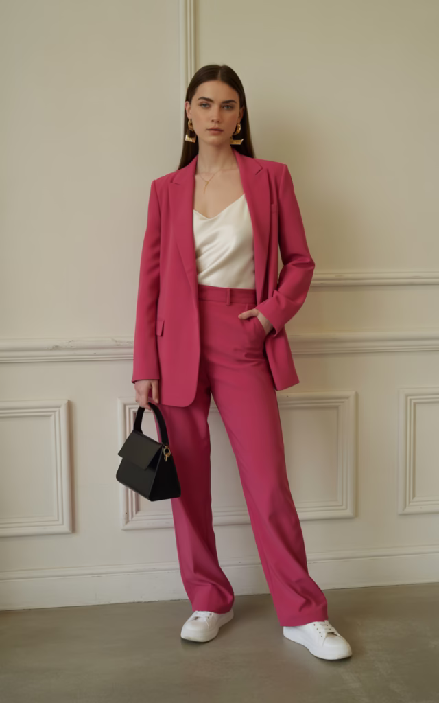 - Garment: Fuchsia pink tailored pantsuit