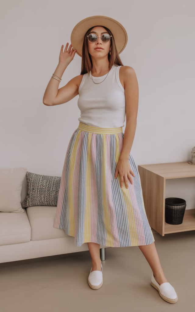 - Bottom: Multi color vertical striped midi skirt (yellow/pink/blue)