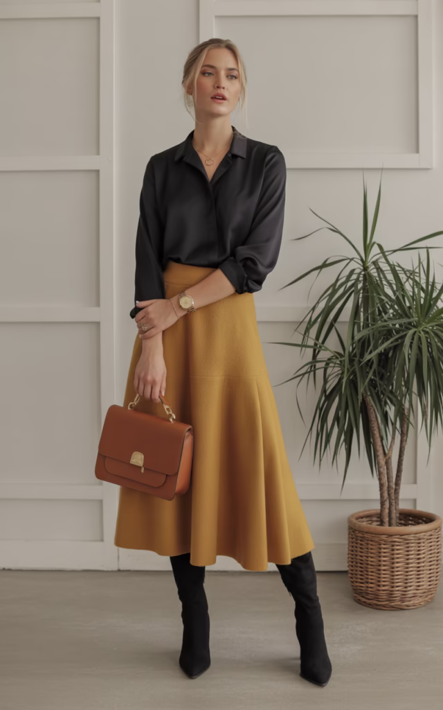 - Bottom: Mustard yellow wool midi skirt (A-Line)