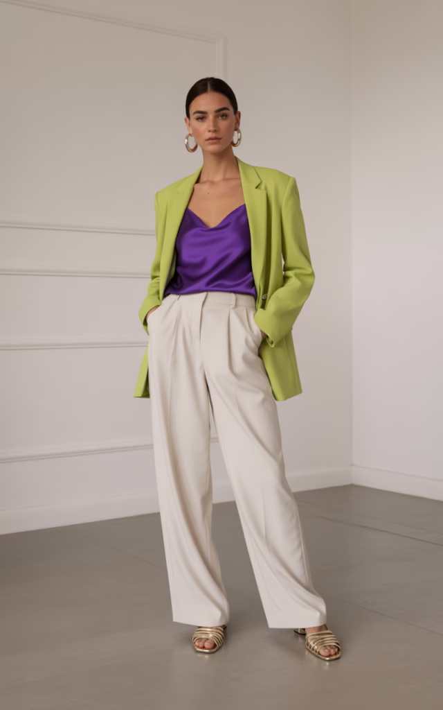 The sharp colors create a dynamic tension that makes the whole outfit feel completely energetic.