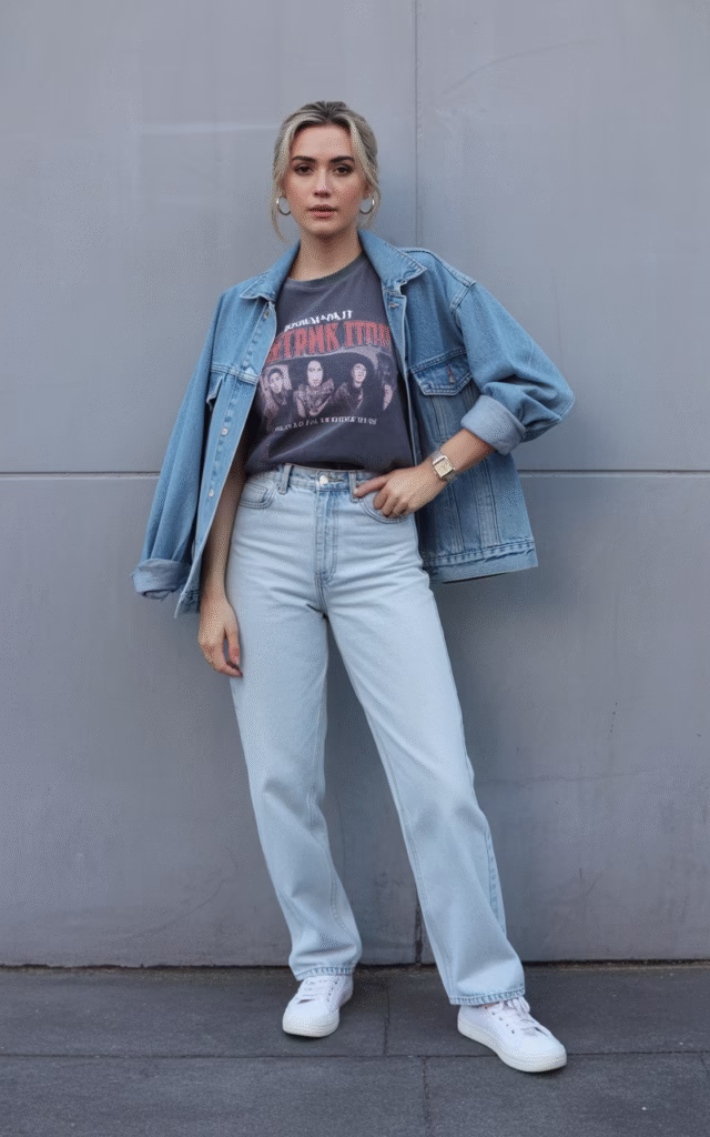 The graphic tee shows a little personality, and the denim jacket is perfect for chilly classrooms.