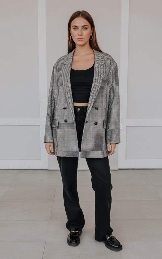 The oversized plaid blazer is borrowed confidence, the weight of adult expectations resting on young shoulders.