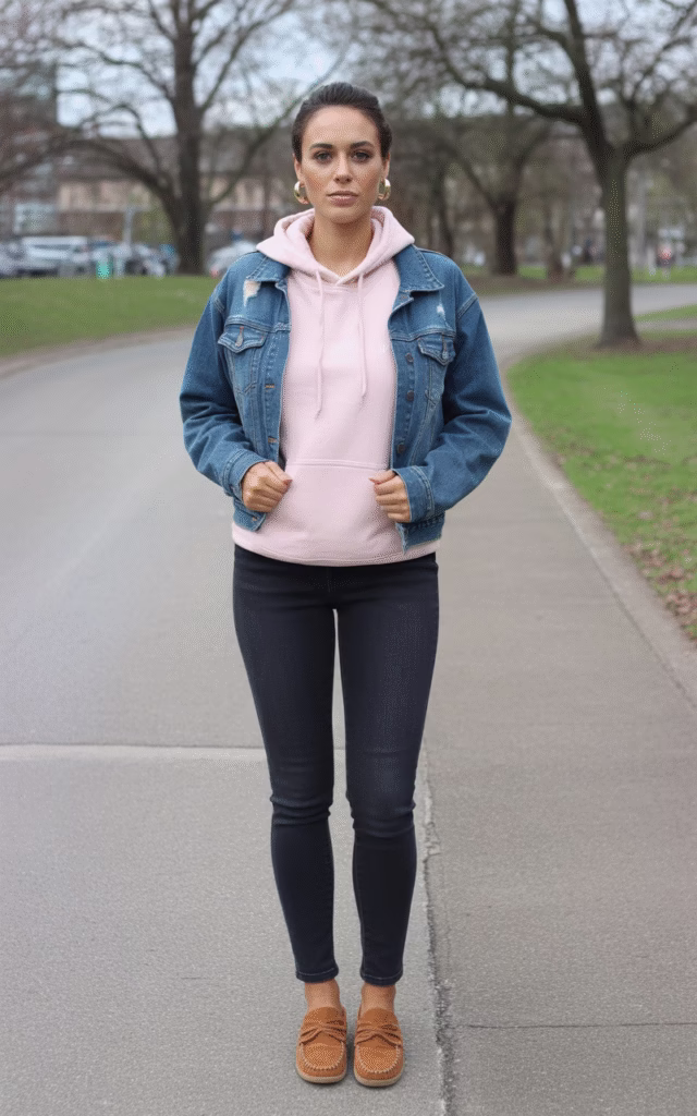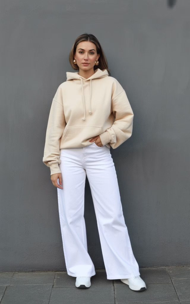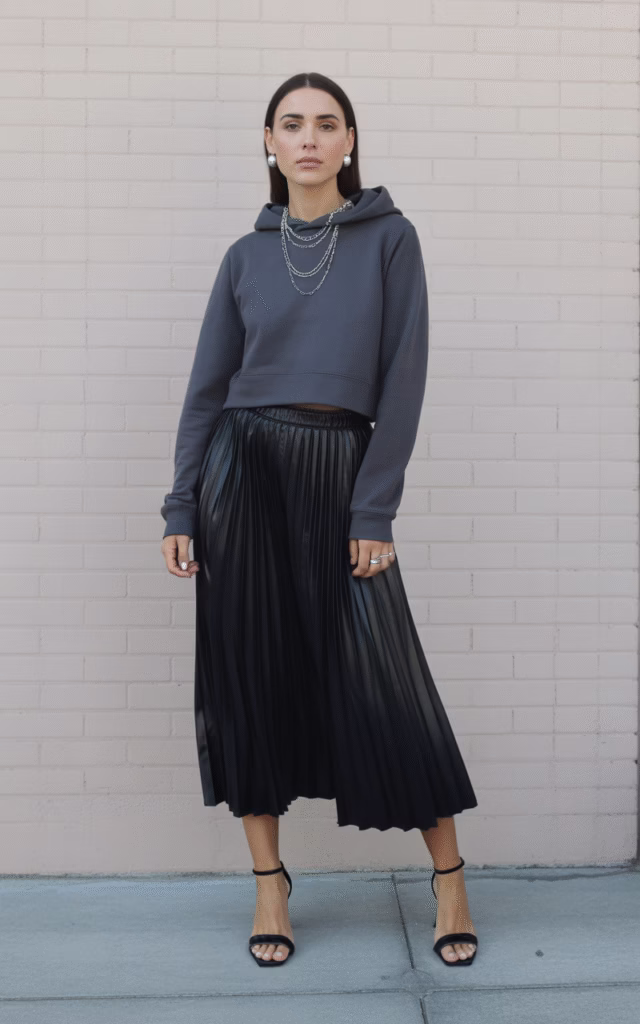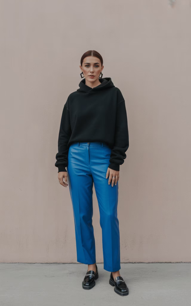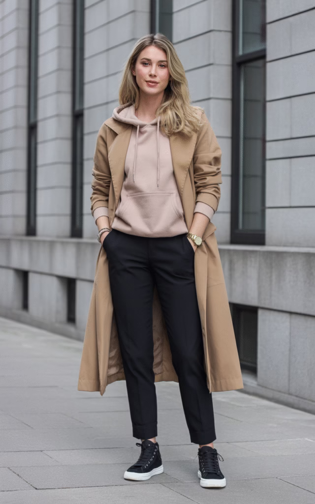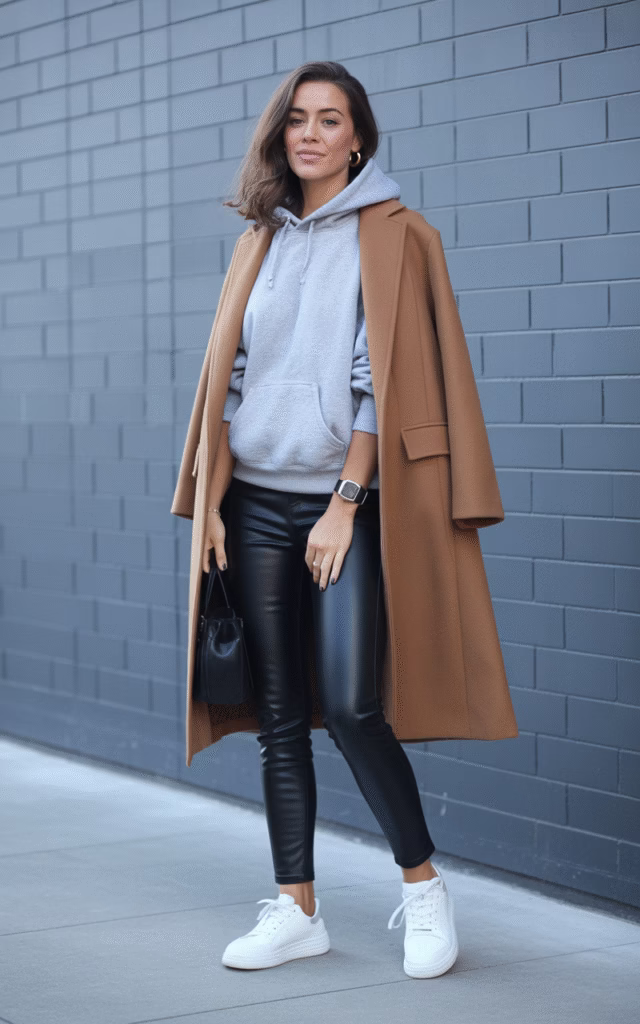 I saw an outfit like this on an influencer’s street style post, the tailored coat makes the hoodie look like a choice, not an accident.