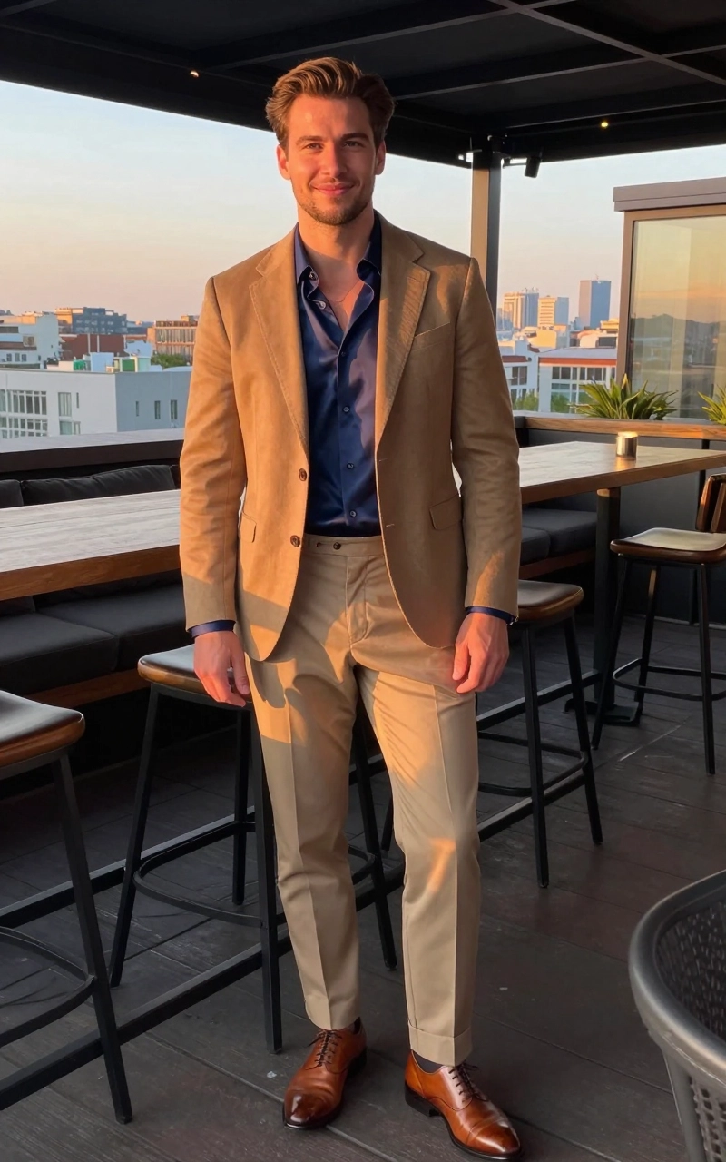 - Bottom: Tan tailored trousers.