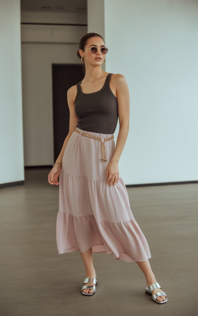 A tiered or layered skirt adds horizontal lines and volume to the lower body, which helps balance the straight torso.