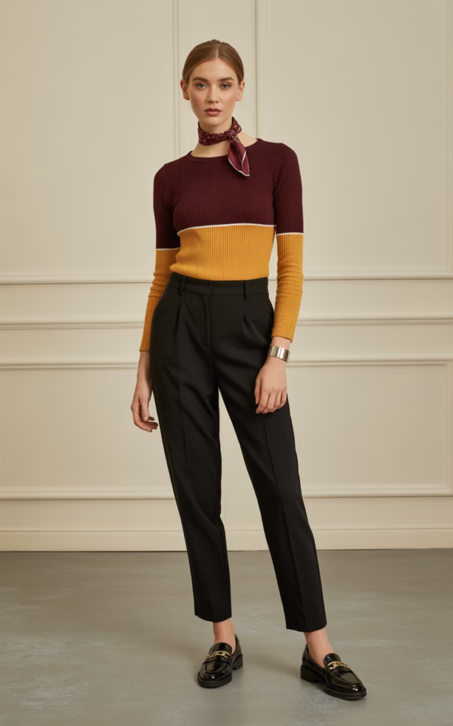 - Top: Fitted sweater (maroon top half, mustard yellow bottom half)