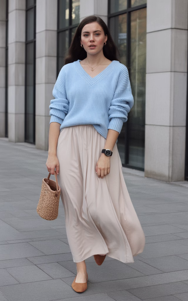 This is one of my favorite styling tricks, layering a simple sweater over a flowing skirt.